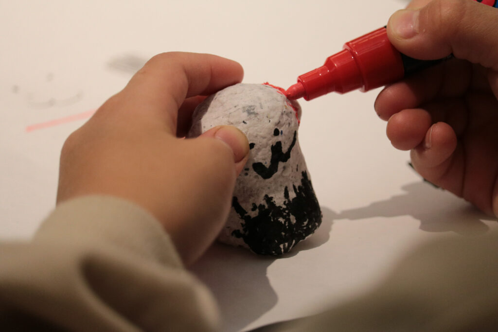 『あなたのもとへゆかいな奴らがやってくる♪ オリジナル張子体験ワークショップ』では、回収した衣服をあらかじめ加工して制作した紙を使用し、紙をちぎり、貼り、形にし、自由に模様をつけることでオリジナルの張子を制作。