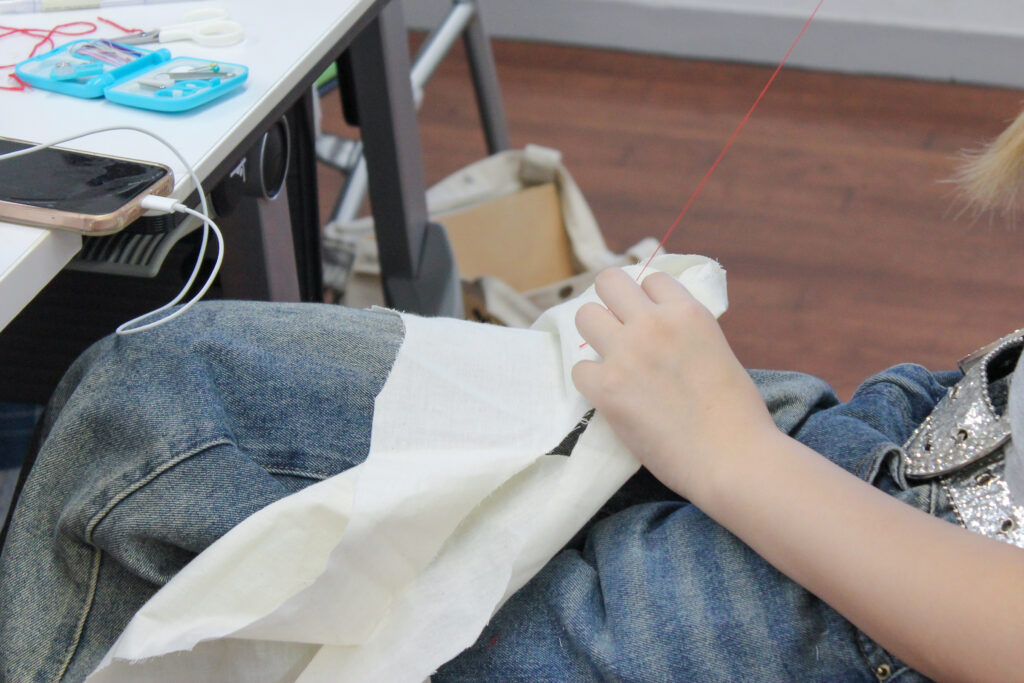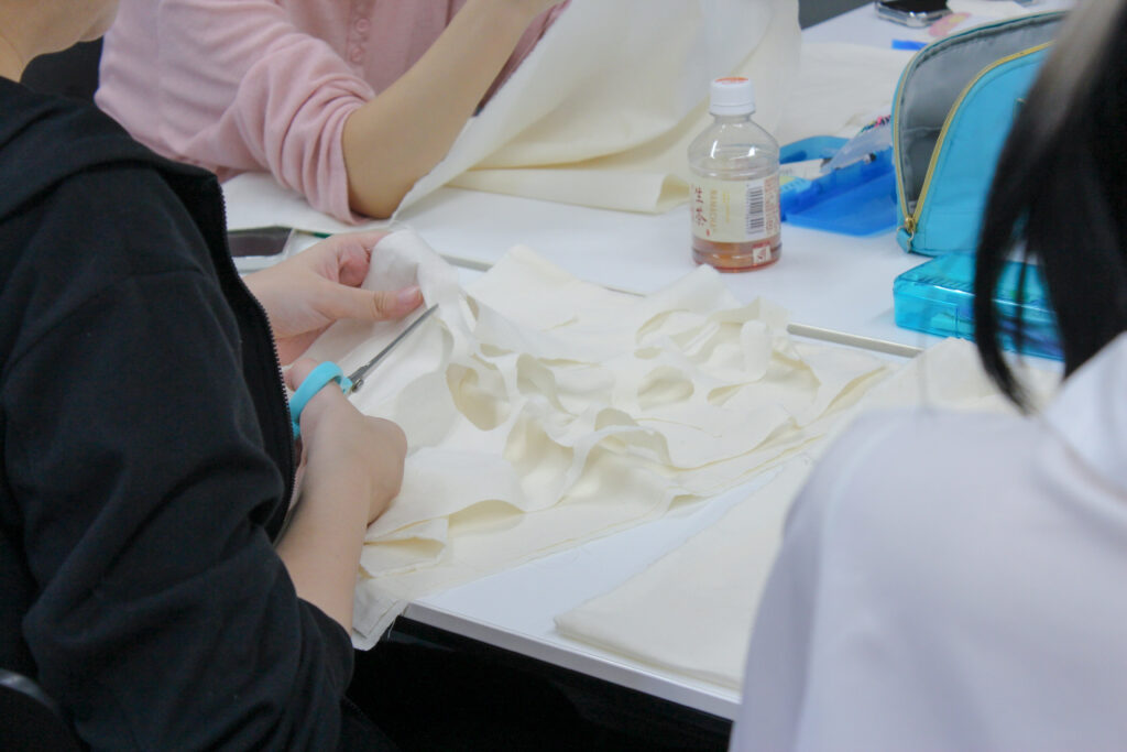 普段はデジタルでの作品制作に取り組むことが多い学生たちにとって、実際に布を扱い手を動かす裁縫作業は新鮮な体験でした。